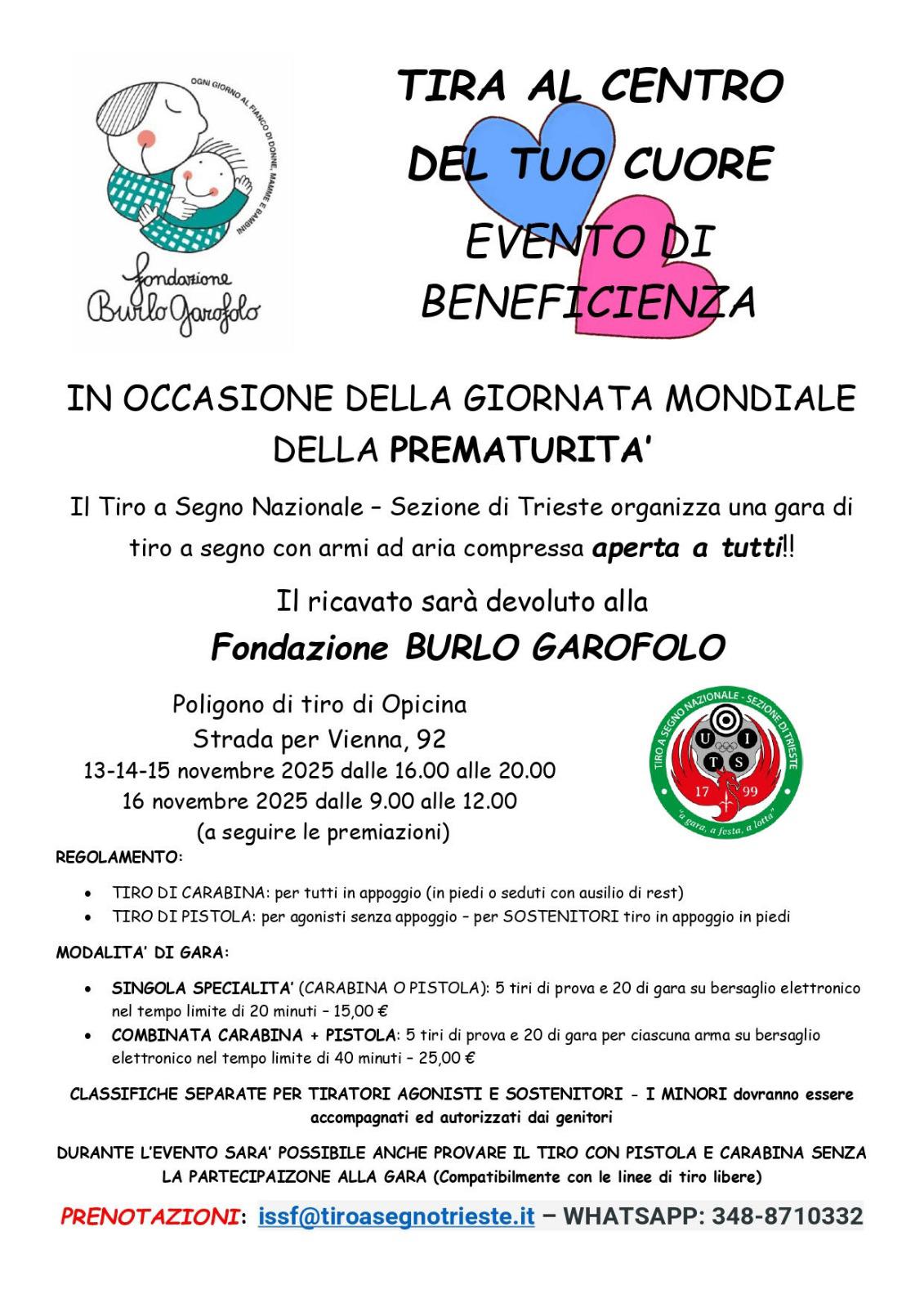 In occasione della Giornata Mondiale della Prematurità, il TSN Trieste organizza una gara ad aria compressa aperta a tutti, a scopo benefico. 🎯